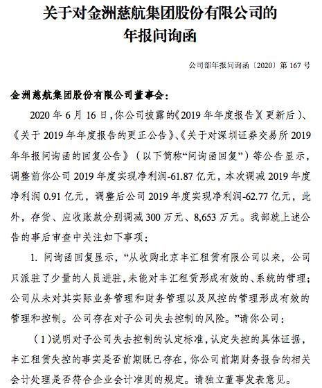 2020年6月17日,年报被出具保留意见的审计报告后,*ST金洲收到第三封年报问询函,要求说明丰汇租赁失控对公司产生的影响。
