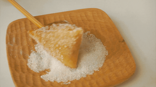 宁波碱水粽的制作需要提前用碱水将糯米浸泡一夜,第二天的糯米好像染上了颜色,拥有了一身“淡黄色的长裙”,用粽叶包裹成三角形状的粽子,上锅蒸熟后,晶莹的碱水粽是半透明色,像灰姑娘的水晶鞋。而那一碗白糖就是它的王子,踮起脚尖,轻轻吻过,既有砂糖的甜,也有碱水糯米的香,老黄箬叶的清新锦上添花,一切都令人流连忘返。