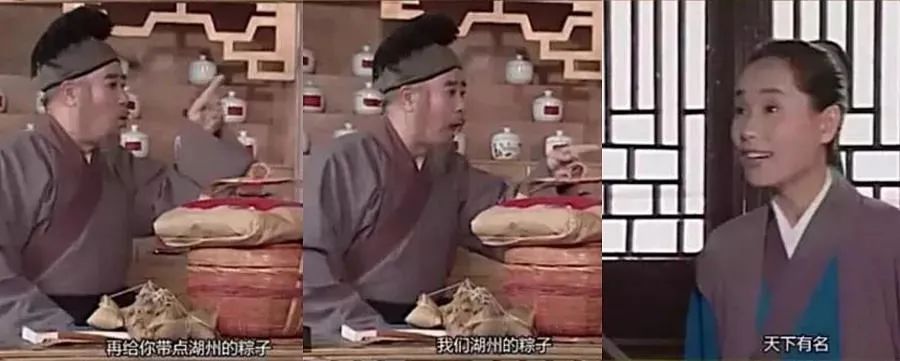 《白蛇传》里的许仙也是湖州粽的忠实爱好者。许仙放药铺陶掌柜回家过节,陶掌柜是湖州人,一句“我们湖州的粽子跟宜兴的紫砂壶一样,天下有名”,许仙立马接到“好,那你快去快回啊!”