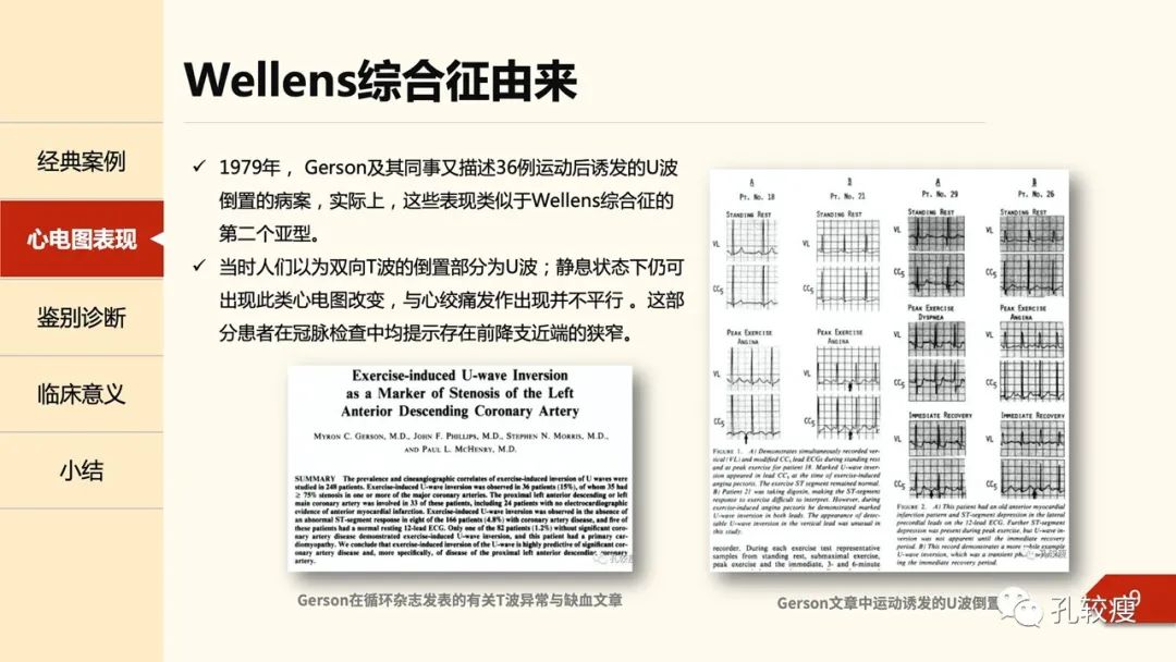1979年, Gerson及其同事又描述36例运动后诱发的U波倒置的病案,实际上,这些表现类似于Wellens综合征的第二个亚型。当时人们以为双向T波的倒置部分为U波;这部分患者在冠脉检查中均提示存在前降支近端的狭窄。时隔一年,Gerson在文章中再次描述了部分患者在静息状态下仍可出现此类心电图改变,与心绞痛发作出现并不平行。