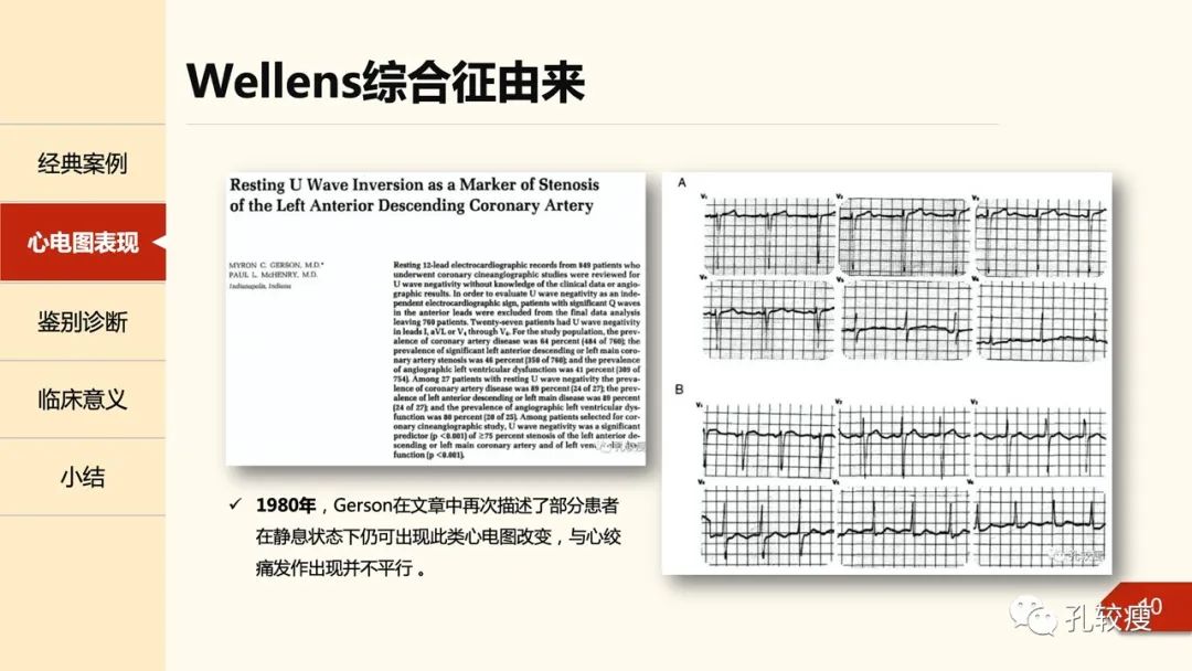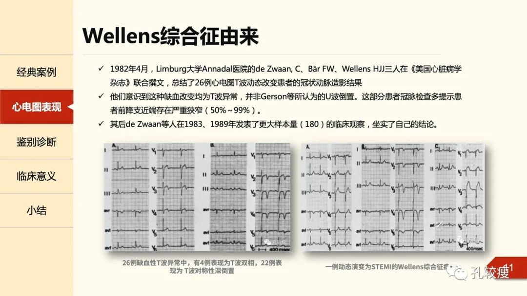 实际上,最早系统提出这一心电图改变,并确认其与冠脉狭窄有关的并非Wellens,与其同一时期的许多其它作者也提到了这一特殊的心电图现象,Gerson即比他早3年确定了心电图改变与冠脉狭窄的关系。