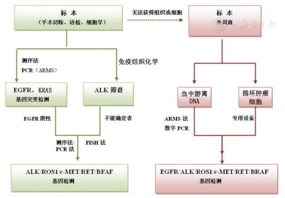 3) 对于组织学已确诊但已无组织标本可用或已无法获取肿瘤组织或细胞学标本的 NSCLC 患者,在实验室条件和检测技术允许的情况下可尝试对其循环肿瘤细胞或血中游离DNA进行上述基因的检测[11]。