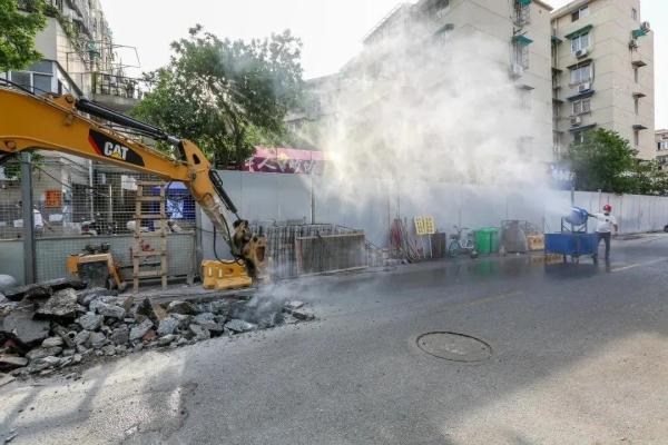 镐头机精确地对路面进行破碎,扬起的粉尘被水雾牢牢“锁住”,以肉眼可见的速度下落在碎开的路面上。一旁的工人们拿着清洁用具随时待命,待破碎结束后开始清扫路面。一个阶段的路面破碎工作结束后,现场还是和破碎前一样整洁干净 摄影:李时宇城市管网建设离不开广大民众的支持