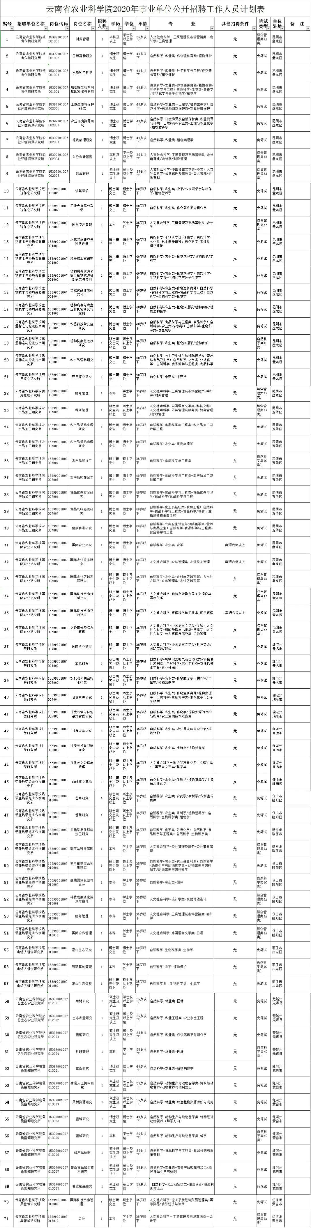 根据《云南省事业单位公开招聘工作人员办法》(云人社发〔2016〕182号)等有关文件规定,结合工作需要,经云南省人力资源和社会保障厅批准,云南省农业科学院2020年计划面向社会公开招聘工作人员71名。