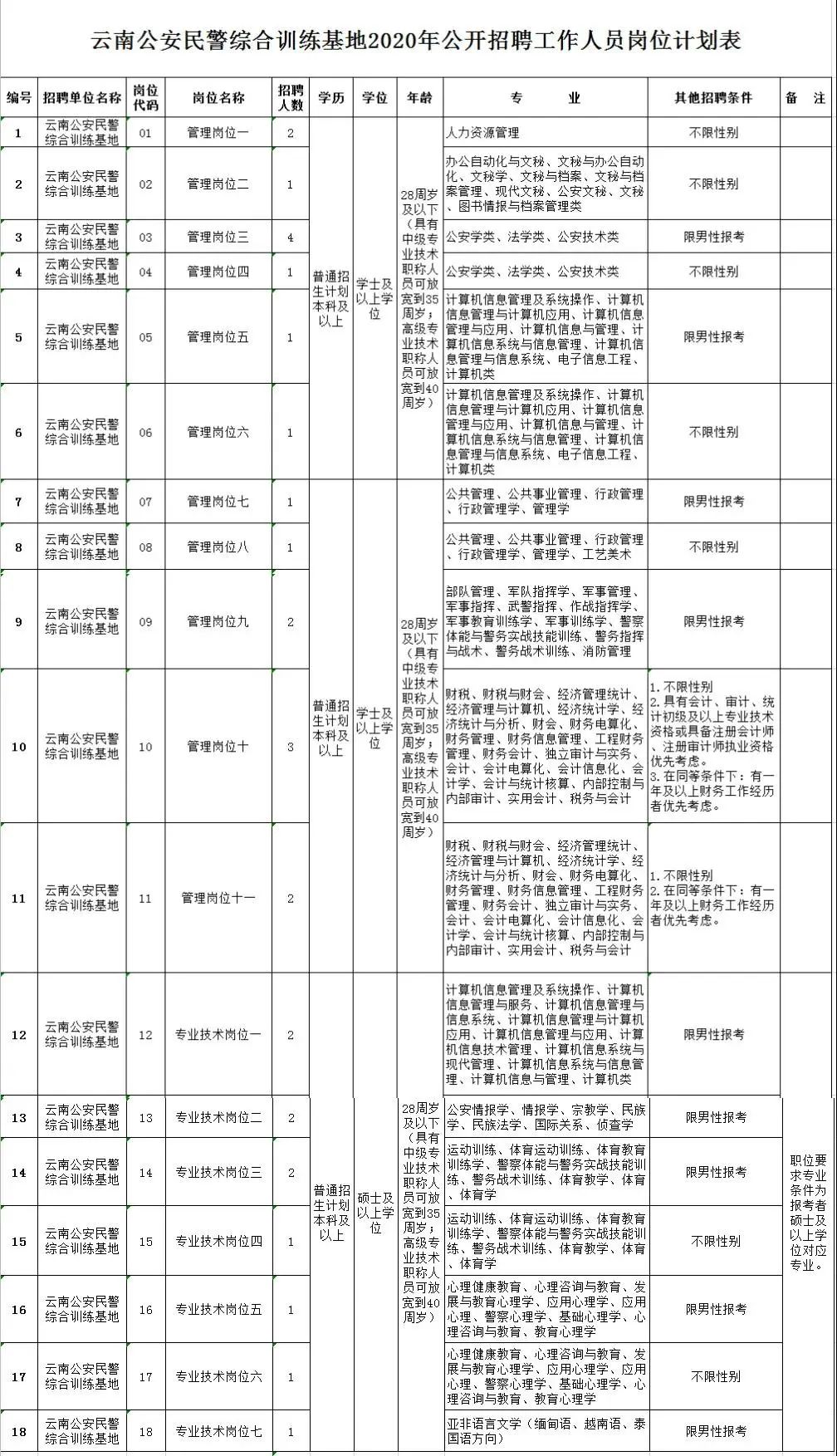 云南公安民警综合训练基地计划面向社会公开招聘工作人员29名,其中管理岗位人员19名,专业技术岗位人员10名。