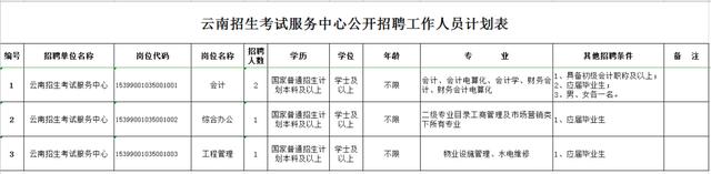 根据《云南省事业单位公开招聘工作人员办法》(云人社发〔2016〕182号)等有关文件规定,结合工作需要,经云南省人力资源和社会保障厅批准,云南省教育厅直属事业单位云南招生考试服务中心2020年计划面向社会公开招聘工作人员 4 名。