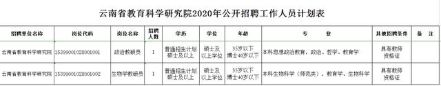 根据《云南省事业单位公开招聘工作人员办法》(云人社发〔2016〕182号)等有关文件规定,结合本单位工作需要,经省人力资源和社会保障厅批准,云南省教育厅直属事业单位云南省教育科学研究院2020年面向社会公开招聘工作人员2名。