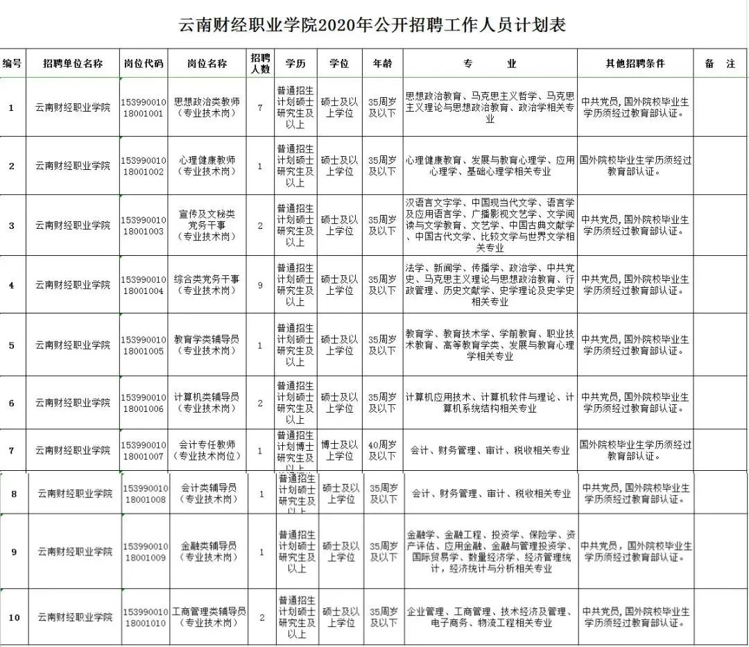 根据《云南省事业单位公开招聘工作人员办法》(云人社发〔2016〕182号)等有关文件规定,结合工作需要,经云南省人力资源和社会保障厅批准,云南财经职业学院2020年计划面向社会公开招聘工作人员27名。