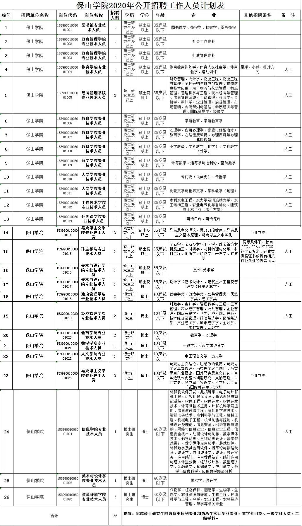 保山学院公开招聘工作人员36名,其中博士研究生16名,硕士研究生20名。