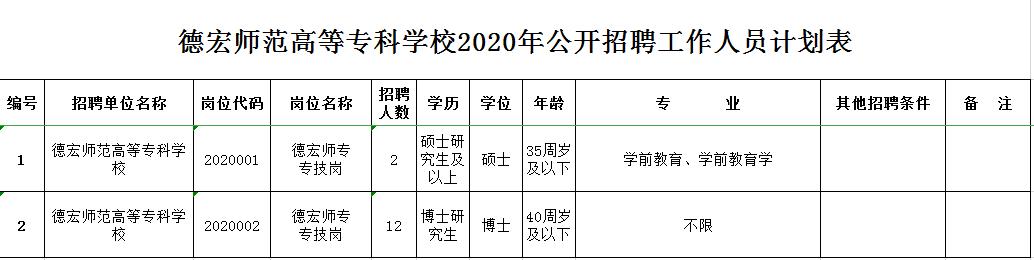 根据《云南省事业单位公开招聘工作人员办法》(云人社发〔2016〕182号)等有关文件规定,结合学校发展需要,经云南省教育厅、云南省人力资源和社会保障厅批准,德宏师范高等专科学校2020年计划面向社会公开招聘工作人员14名。