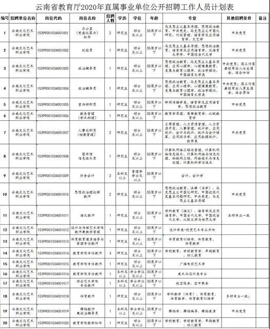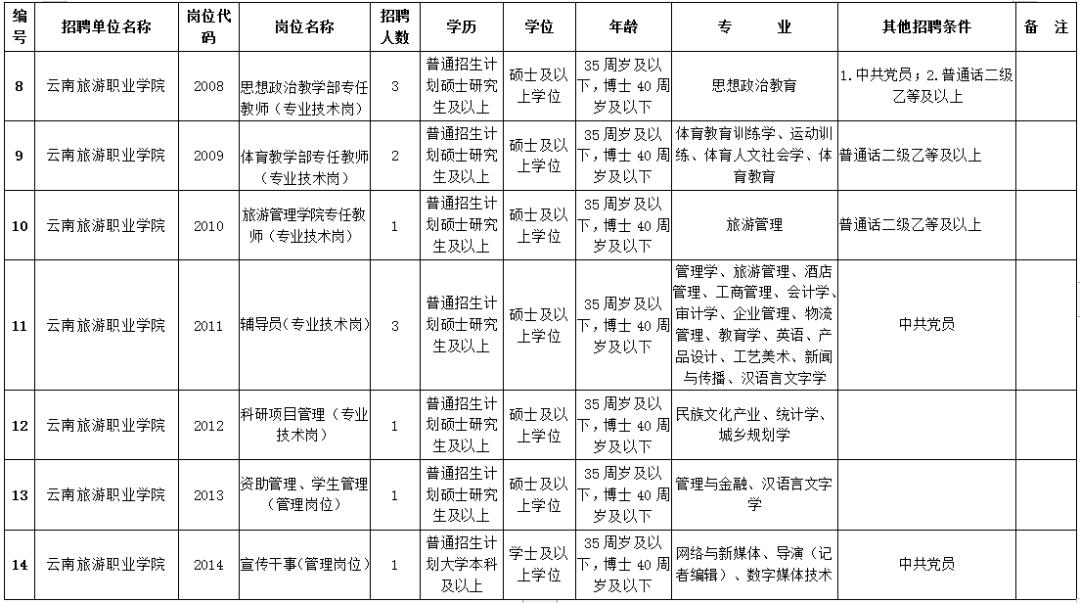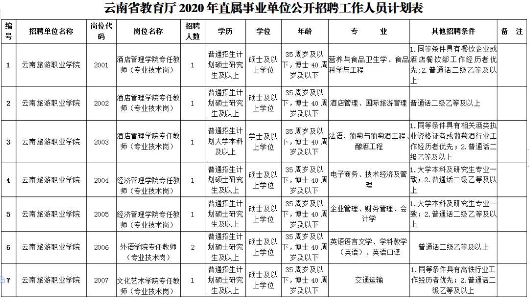 根据《云南省事业单位公开招聘工作人员办法》(云人社发〔2016〕182号)等有关文件规定,结合工作需要,经云南省人力资源和社会保障厅批准,云南旅游职业学院 2020年计划面向社会公开招聘工作人员20名。
