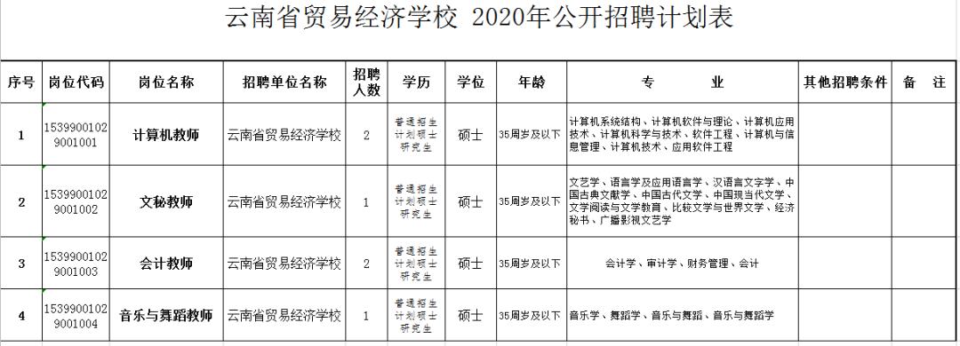 根据《云南省事业单位公开招聘工作人员办法》(云人社发〔2016〕182号)等有关文件规定,结合工作需要,经云南省人力资源与社会保障厅批准,云南省贸易经济学校2020年计划面向社会公开招聘工作人员6名。