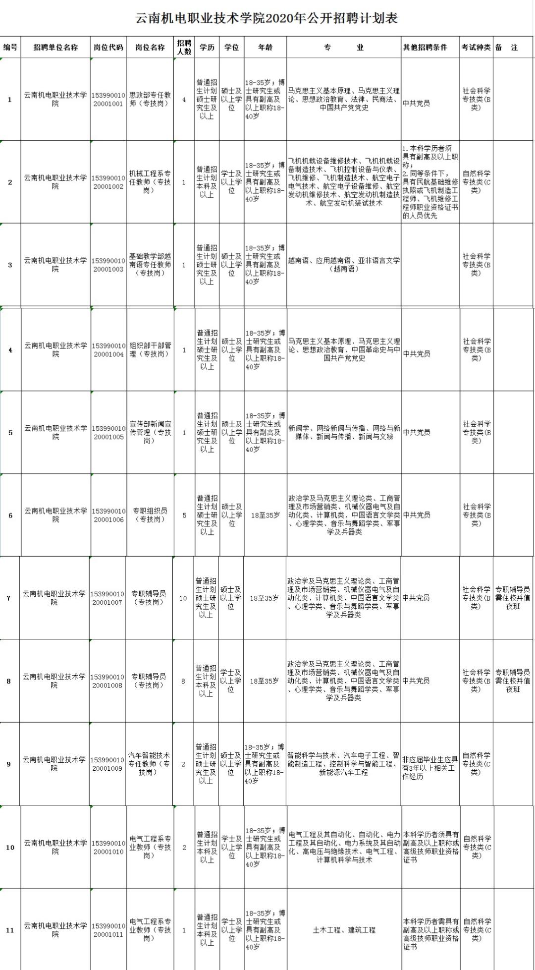 云南机电职业技术学院共招聘工作人员36名。
