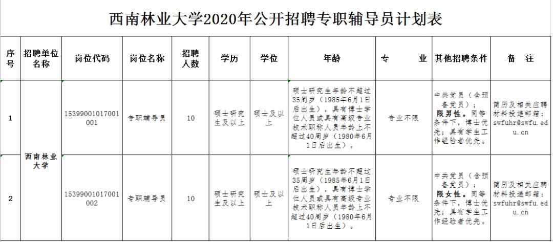根据《云南省事业单位公开招聘工作人员办法》(云人社发〔2016〕182号)等有关文件规定,结合工作需要,经云南省人力资源和社会保障厅批准,西南林业大学2020年计划面向社会公开招聘专职辅导员20名。