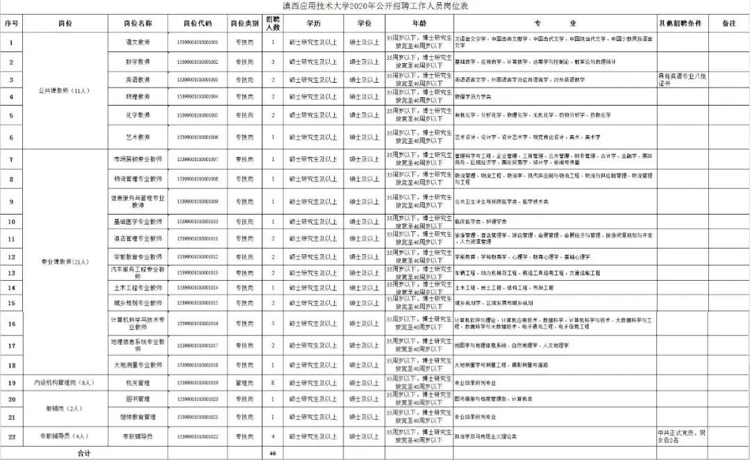 根据《云南省事业单位公开招聘工作人员办法》(云人社发〔2016〕182号)等有关文件规定,结合工作需要,经云南省人力资源和社会保障厅批准,滇西应用技术大学2020年计划面向社会公开招聘工作人员46名。