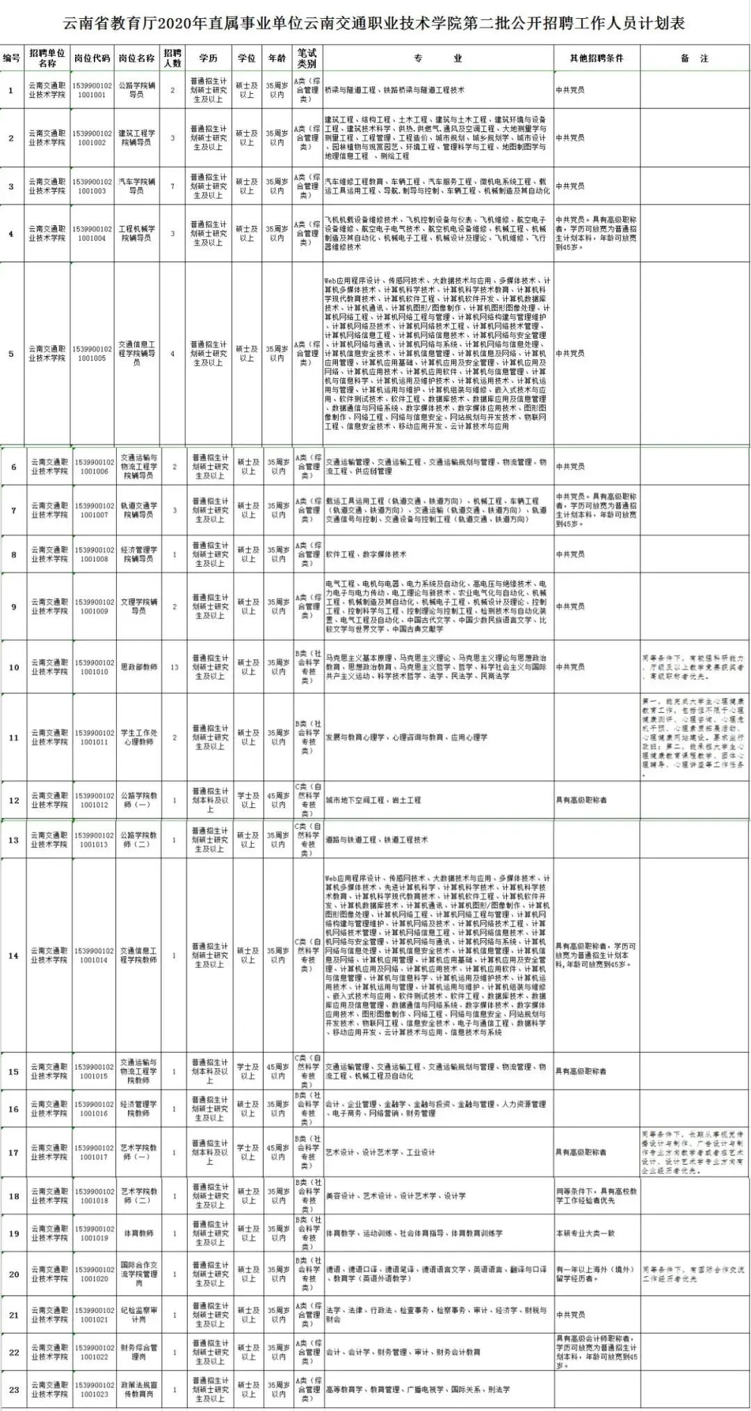 云南交通职业技术学院2020年第二批公开招聘事业单位工作人员54名。