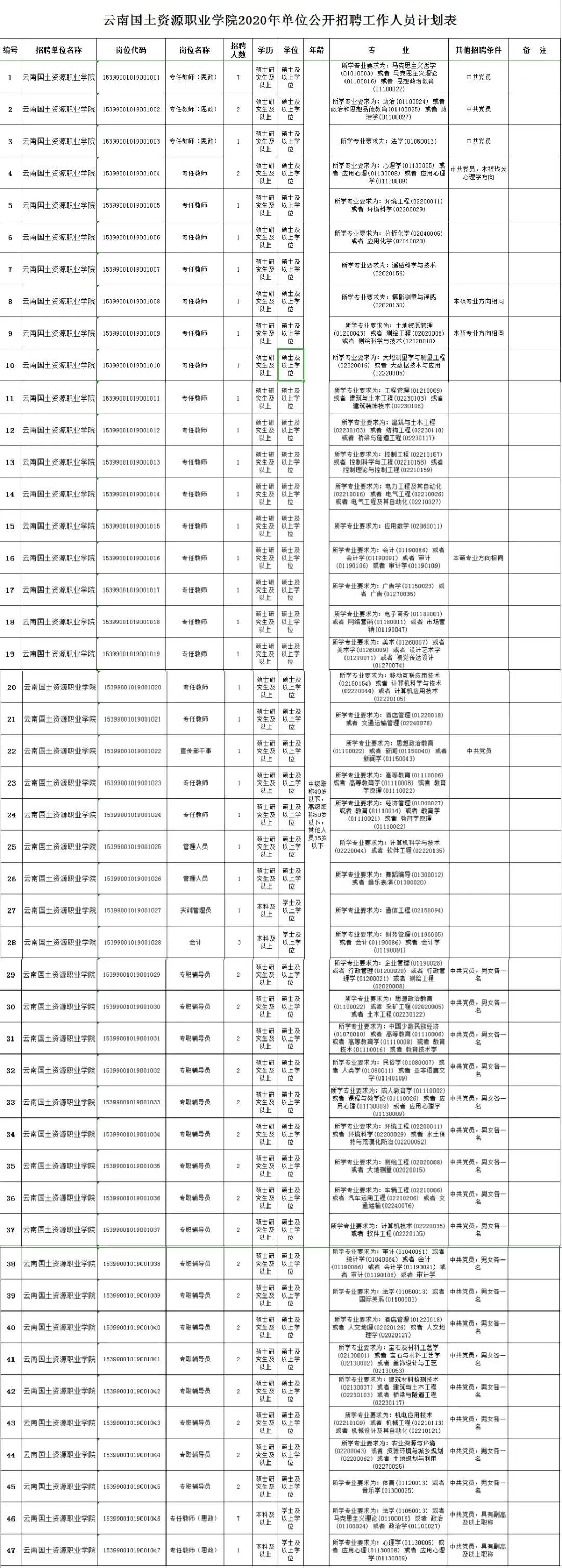 根据《云南省事业单位公开招聘事业编制工作人员办法》(云人社发〔2016〕182号)等有关文件规定,结合工作需要,经云南省人力资源和社会保障厅批准,云南国土资源职业学院2020年计划面向社会公开招聘事业编制工作人员80名。