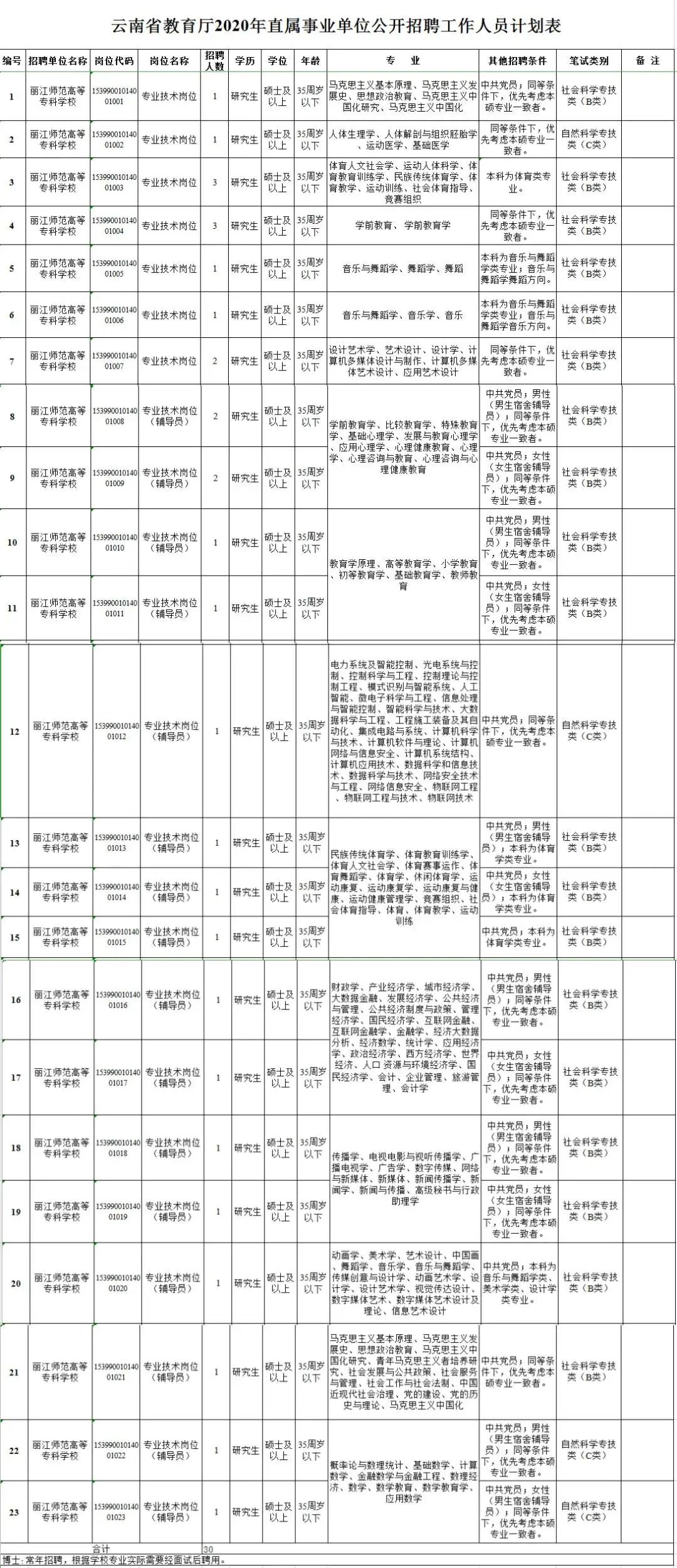 根据《云南省事业单位公开招聘工作人员办法》(云人社发〔2016〕182号)等有关文件规定,结合工作需要,经云南省人力资源和社会保障厅批准,丽江师范高等专科学校2020年计划面向社会公开招聘工作人员30名。