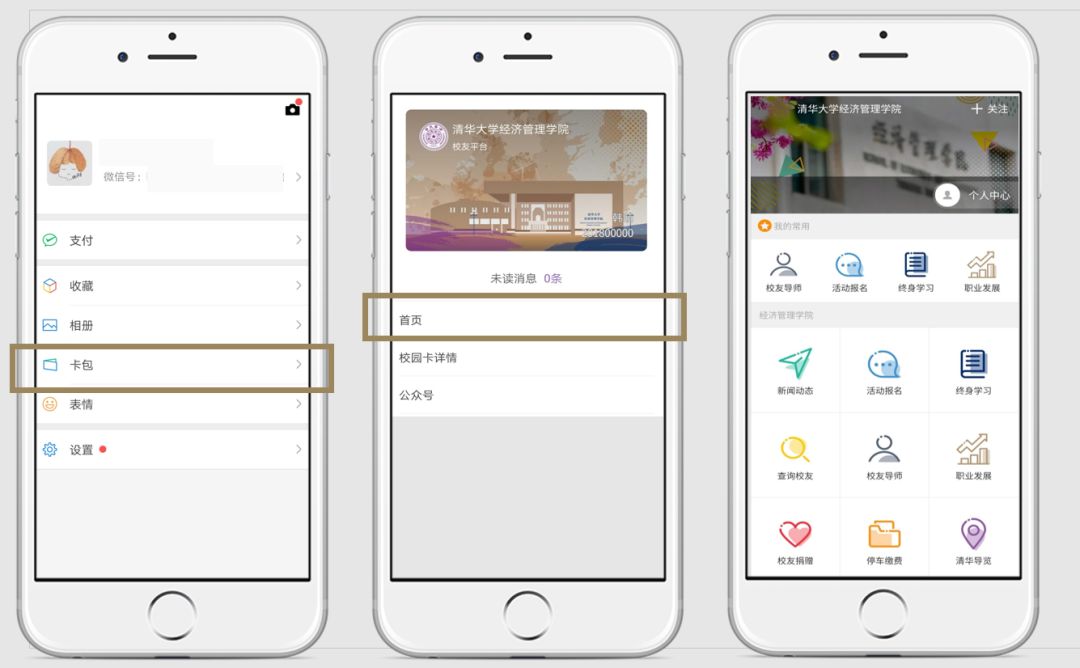 “清华经管学院校友平台“将通过“微信卡包”发放,其主要功能如下: