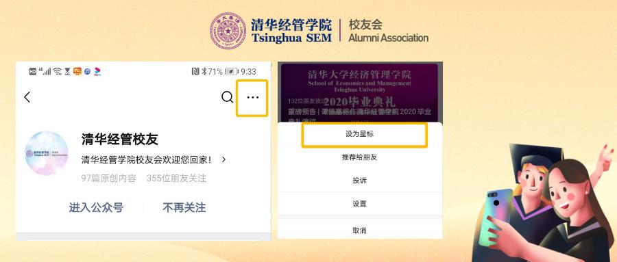 “清华经管校友”微信公众号由学院校友发展中心运营,向广大校友提供诸多信息,并与清华经管学院校友网、清华经管学院微信校友平台无缝连接。为了更方便即使获取学院信息,校友们可以将“清华经管校友”微信号“设为星标”。