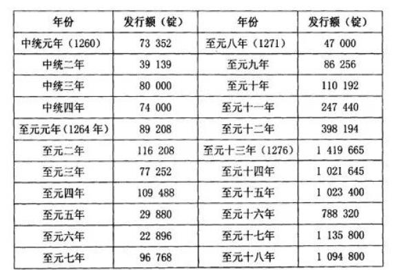 大政府扩张—财政压力增大—超发纸币—大政府继续扩张—继续超发纸币—恶性通货膨胀,这是宋朝纸币这一民间智慧被官方接管后,逐渐变成民众排斥、贬值严重的劣币的基本线索。元代纸币重复了和宋代纸币类似的命运,按照《元史·食货志·一》和《经世大典·钞法》记载,元代早期纸币发行“印造支发,岁有经数”,发行数量有一定的限制,每年印发纸币数量确实稳定在十万左右(见下表),并且元政府都有相应的准备金,因此这段时间里币值稳定,商业繁荣,经济兴盛,但自元顺帝至元年间(1335年—1340年)后期开始,为了弥补财政亏空,元帝国疯狂印钱,至元二十二年、二十三年分别印钞二百四万三千八十锭和二百一十八万一千六百锭,通货膨胀恶化,造成严重社会灾难。元末昆山文人顾瑛(1310年-1369年)在他的诗歌中留下了真实的记录: