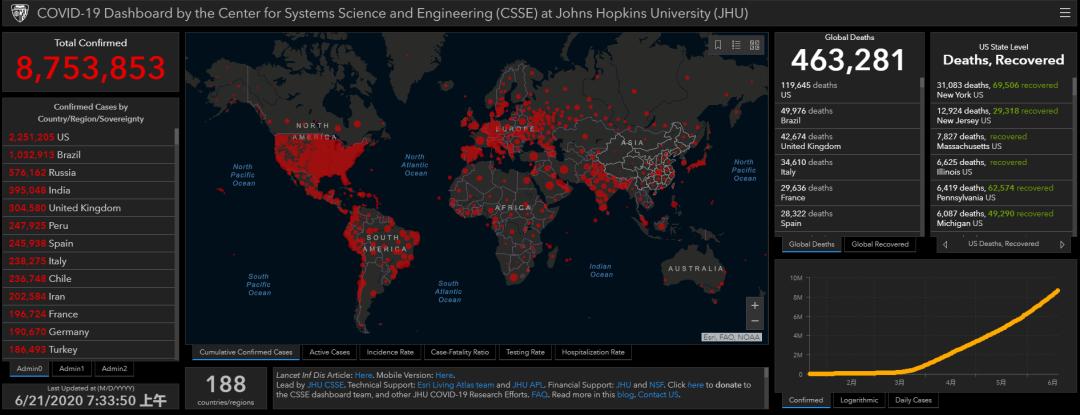 美国约翰斯·霍普金斯大学发布的实时统计数据显示,截至北京时间6月21日7时30分左右,全球累计确诊新冠肺炎病例超875万例,累计死亡463281例。