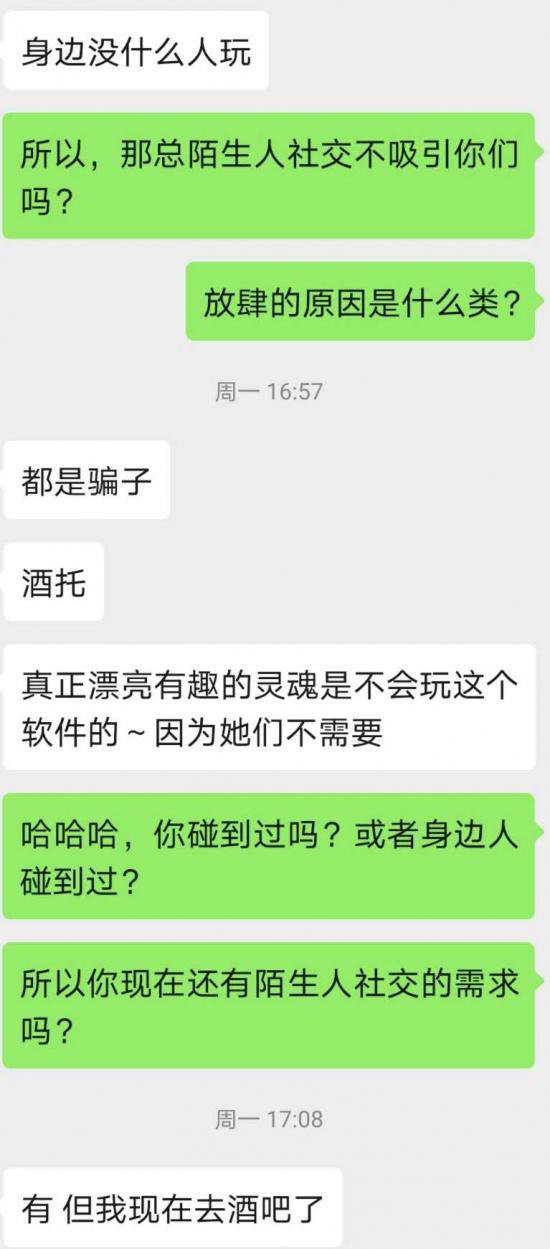 “现在早没用了,不光是我,我身边还有朋友,跟一个‘妹子’聊了好久,到头来向他推销茶叶的,还听说这些软件里面还有好些“机器人”,就是你以为对方是个人在与你交谈,其实都是“机器人”在跟你说话,当然这些我没法判断,也不知道是不是遇到过。他们说探探和Soul比陌陌靠谱,没这么多广告和托,但第一次就怕了,我是不会再用,讲真‘酒吧社交’比这还靠谱。”