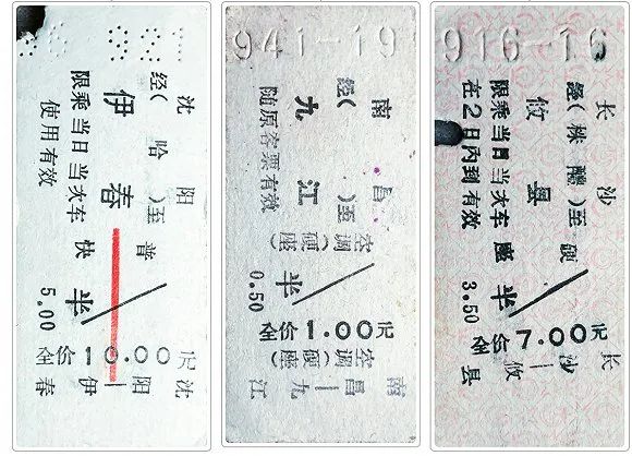 票面颜色:软座客票为浅蓝色,硬座客票为浅红色,市郊客票为浅紫色,棚车客票为橙黄色;加快、卧铺、空调等票为白色无底纹。