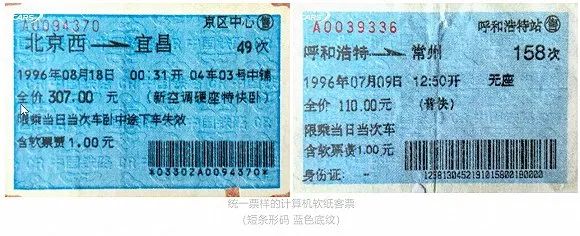 从那时起,中国铁路客票采用两种形式,即红色底纹的计算机软纸客票和蓝色底纹的磁介质客票。