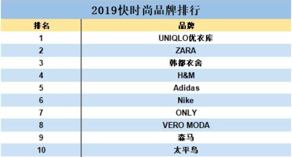 去年,《互联网周刊》和eNet研究院联合发布了2019快时尚品牌排行榜,其中优衣库、ZARA和韩都衣舍位列前三,后七位分别是H&M、Adidas、Nike、ONLY、VERO MODA、森马和太平鸟。