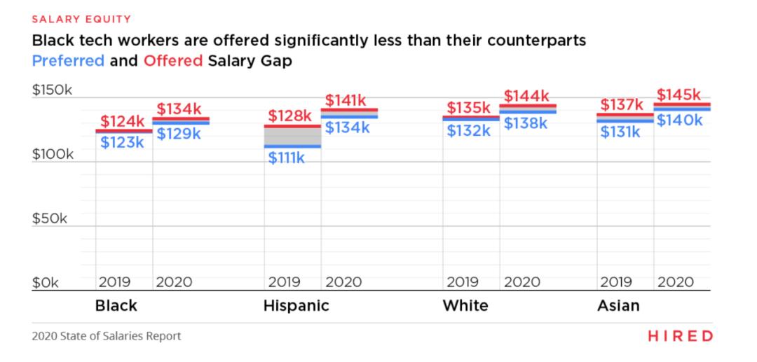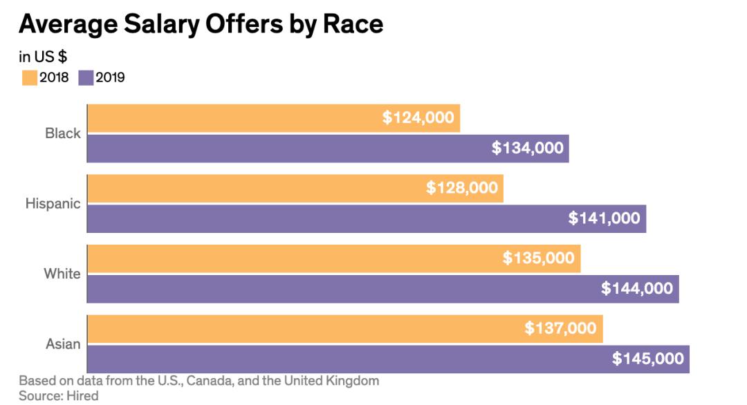 那么,不同族裔之间是否存在差异?存在哪些差异呢?近日,美国招聘网站 Hired 发布的《2020 年技术薪资报告》(2020 State of Salaries Report)从薪资层面上展示了这种差异。