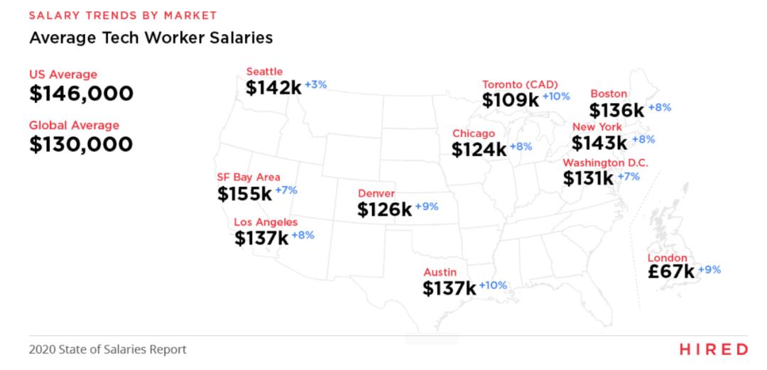 旧金山湾区仍然是技术行业薪资最高的地区,平均薪资为 155k 美元,相比于去年增长了 7%。