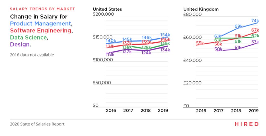 Hired 分析了产品经理、软件工程师、设计师以及数据科学家这些职位的薪资之后,发现去年美国和英国这些职位的薪资水平均有所增长。