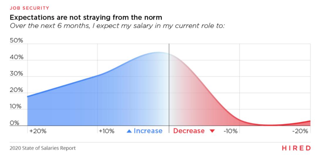 大多数技术人才不认为工资会下降,其中将近一半(49%)认为未来半年内薪资将会上涨,44% 认为薪资持平。