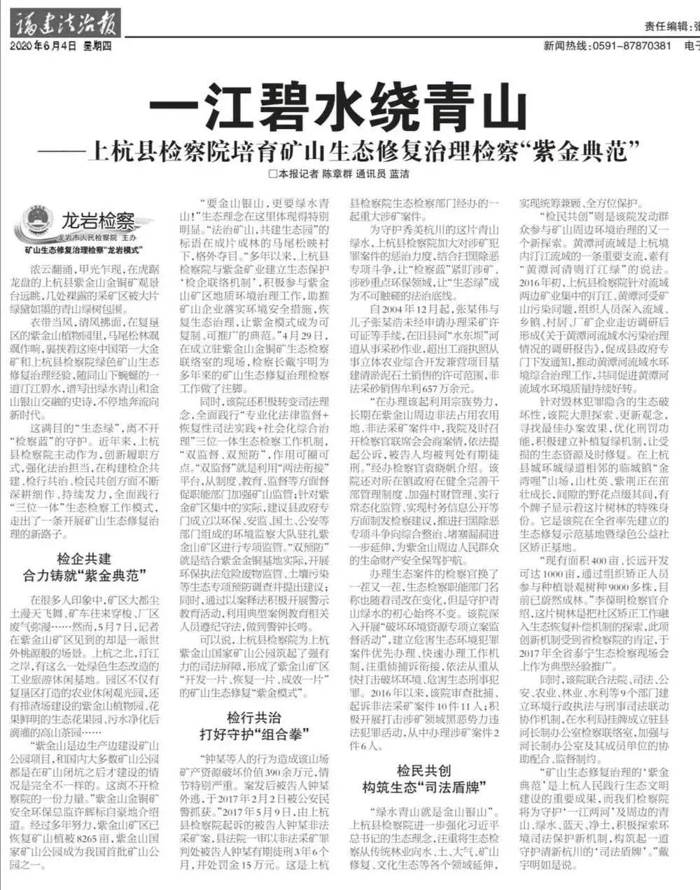 “矿山生态修复治理的‘紫金典范’是上杭人民践行生态文明建设的重要成果,而我们检察院将为守护“一江两河”及周边的青山、绿水、蓝天、净土,积极探索环境司法保护新机制,构筑起一道守护清新杭川的‘司法盾牌’。”戴宇明如是说。