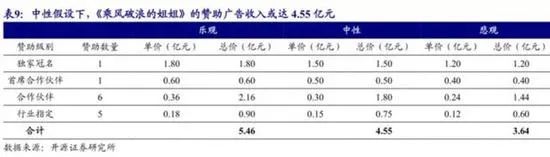 除了会员和股票这样简单粗暴的财富来源,最直接影响到芒果超媒净利润的应属《姐姐》IP的变现能力。根据芒果TV数据,《姐姐》的赞助方有13家,除了梵蜜琳和金典有单独的小剧场广告以外,其余品牌均是通过口播、花字和品牌露出的形式出现在节目里。开源证券研报进行了乐观预计:《姐姐》的赞助广告收入最多可高达5.46亿元。