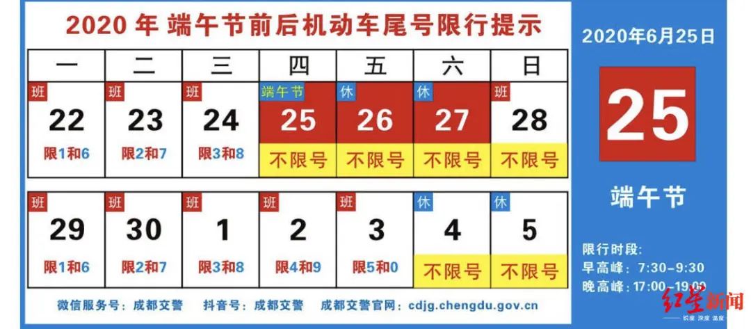 2020年“端午节”假期为6月25日至27日(3天),期间机动车尾号不限行,节后6月28日是星期日,为调休工作日,也不实施尾号限行措施。6月23日,成都交警分析近年来端午节的交通情况,发布2020年“端午节”假期“两公布一提示”,同时建议广大驾驶员合理选择出行线路和出行时间,避开出行高峰时段和易堵路段,谨慎驾驶,安全出行。