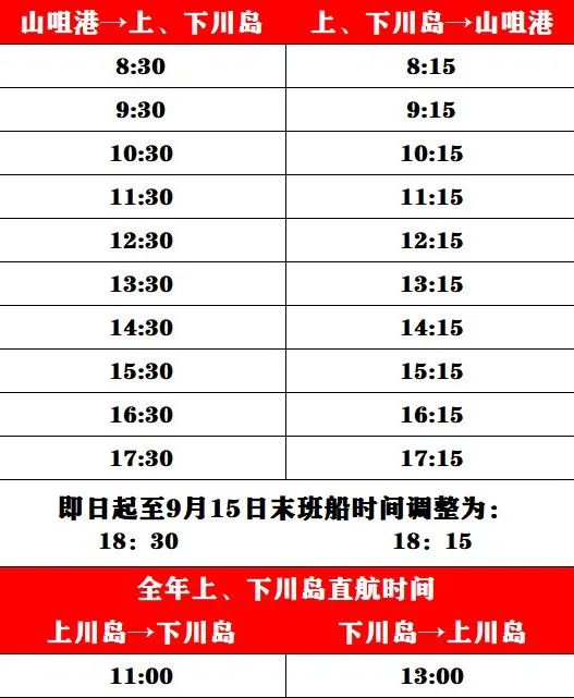 为有序管理山咀港客运航班,从2020年7月1日起,对川岛海上客运航班回程客船时间进行调整,具体如下: