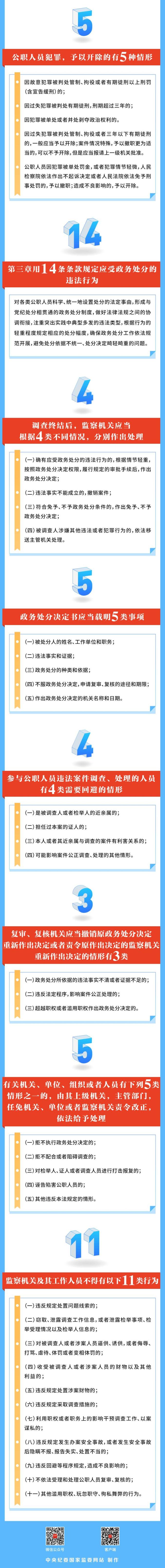 《公职人员政务处分法》共七章六十八条,系统梳理了公务员法、法官法、检察官法和行政机关公务员处分条例等现有关于处分制度的法律法规,从中提炼概括出适用于各类公职人员政务处分的违法情形,根据行为的轻重程度规定了相应的处分档次,设定了警告、记过、记大过、降级、撤职、开除6种政务处分,直接涉及公职人员的职务、职级、级别、薪酬待遇等重要事项,为公职人员的行为划清了底线。