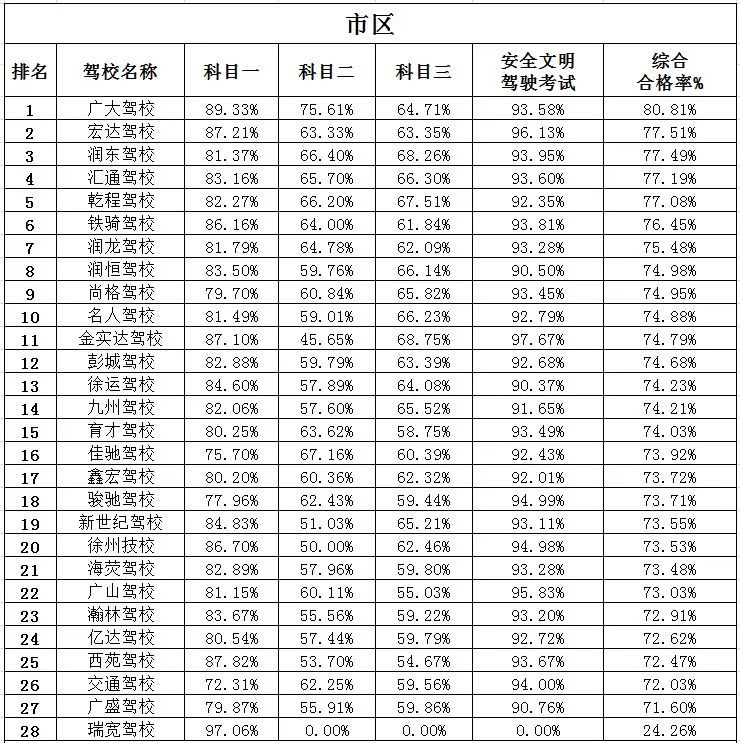 徐州市区驾校考试合格率综合排名前五名的是:广大驾校(80.81%)、宏达驾校(77.51%)、润东驾校(77.49%)、汇通驾校(77.19%)、乾程驾校(77.08%)。