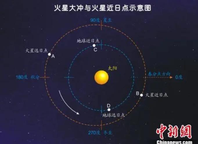 10月14日,天幕将上演火星冲日。届时,火星位于日地连线上,并且和地球同位于太阳的一侧。而当火星在接近近日点时冲,则称为大冲,在太阳系的行星大冲之中,火星大冲是最为典型而壮观的。