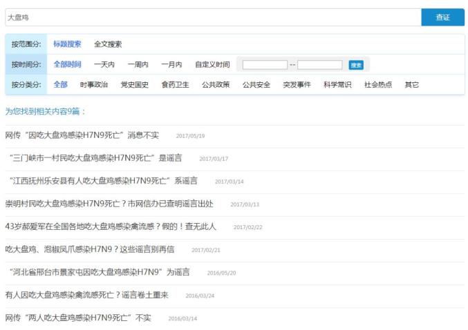 在中国互联网联合辟谣平台的“辟谣数据库”中,以大盘鸡为关键词进行搜索,可以看到多条已经辟谣过的相关信息。