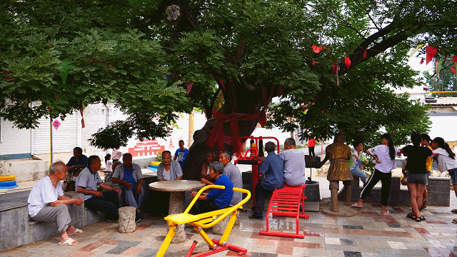 沿路向前,远远看到一棵状如华盖、巍然挺立的老槐树,和着白色的墙、树下的人,这一切在蓝天白云的映衬下,俨然一幅自然和谐的美丽乡村画卷!