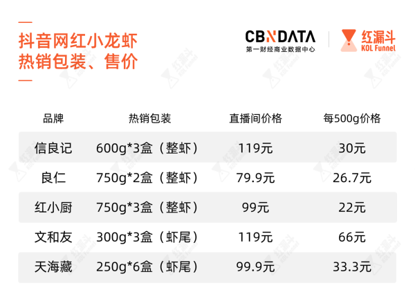 比较后发现,这5个品牌单位价格差异不小,但总体都平易近人。信良记、红小厨、良仁的热销商品都是整虾,最便宜的红小厨1斤22元,最贵的信良记1斤30元。食用方便的虾尾差价更大,文和友1斤虾尾要价66元,天海藏却低至1斤33元,仅比信良记整虾高3元。