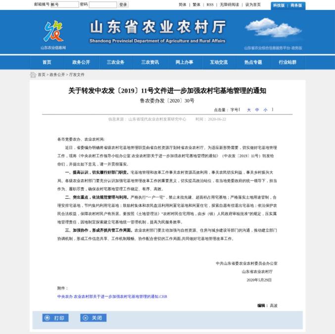 · · 近日,山东省委农业农村委员会办公室、山东省农业农村厅发布《关于转发中农发〔2019〕11号文件进一步加强农村宅基地管理的通知》。