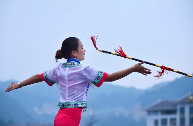 表演这场舞时应手持裹上红绸的竹竿