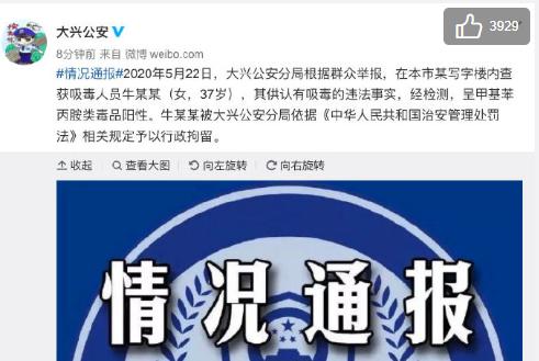 ◆ 警方通报女演员牛萌萌因吸毒被警方行政拘留
