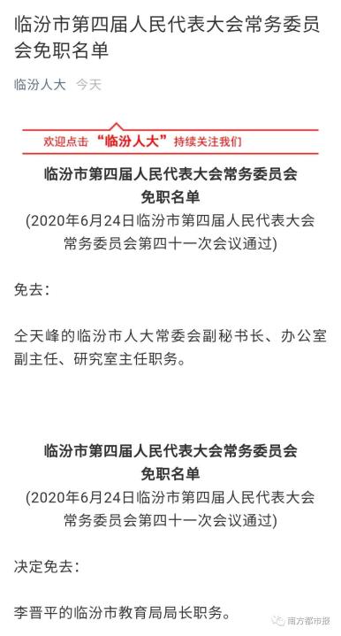 据山西省临汾市人大微信公众号24晚发布通报称,2020年6月24日临汾市第四届人民代表大会常务委员会第四十一次会议通过,决定免去仝天峰的临汾市人大常委会副秘书长、办公室副主任、研究室主任职务。