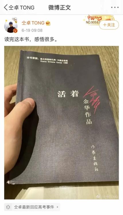 6月19日早上,仝卓在“高考事件”后首次更新微博,他分享了一本余华的《活着》的书本封面,并发文:“读完这本书,感悟很多。”
