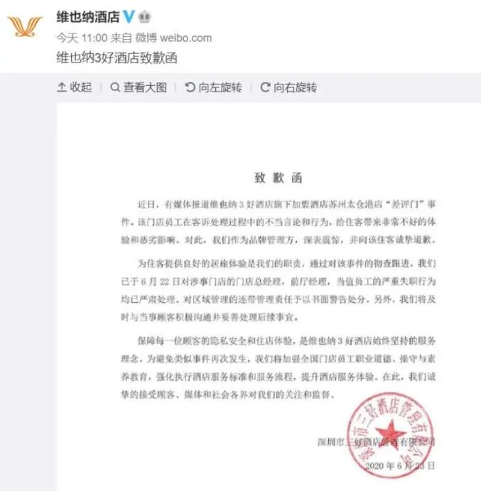 对此,6月24日,维也纳酒店在其官方微博发布《致歉函》,为门店员工在客诉处理过程中的不当言论和行为,以及给住客带来的不好体验和恶劣影响致歉。